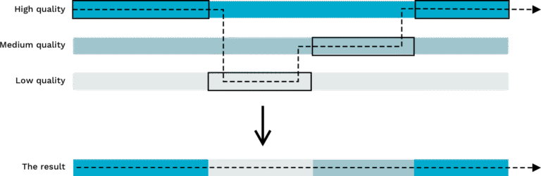 The quality is switched seamlessly so that the viewer shouldn’t see any hiccups or delays on the video stream. Here’s an illustration of the functionality:
